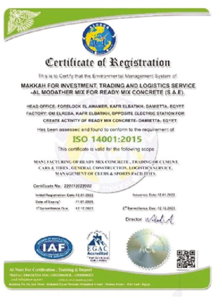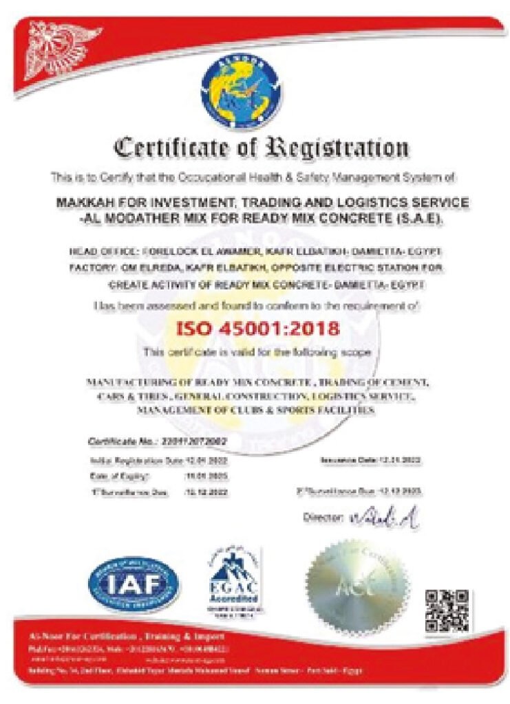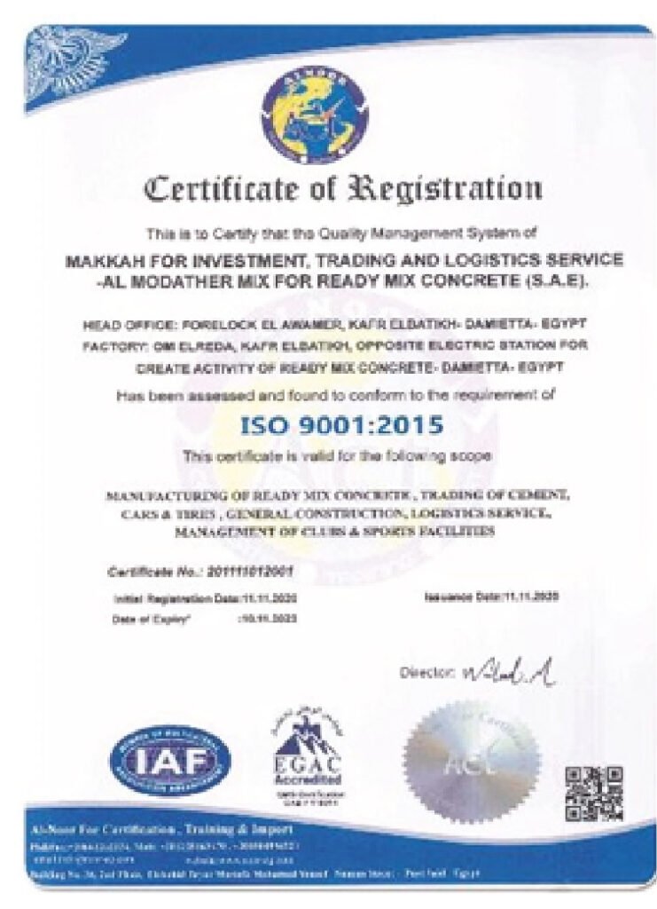 - نظام جودة صارم: معايرة داخلية وخارجية، معامل مجهزة، والتزام بالكود المصري ومعايير ASTM/BS/ACI.